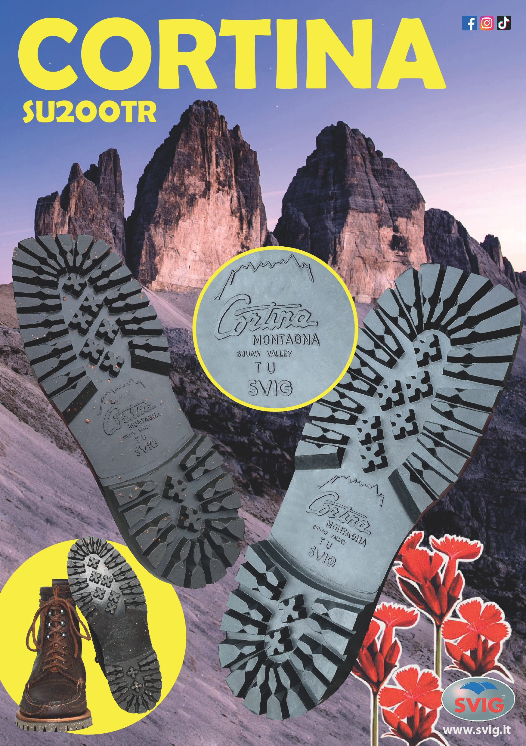 A distanza di tanti anni, le suole Cortina sono ancora attuali: una scelta vincente per gli amanti della montagna e dei prodotti di qualità. Realizzate in mescola Trekking, nota per qualità, comfort e grip, sono disponibili in nero e nella versione più sostenibile in color nicotina con granelli di sughero. Sono sempre la scelta ideale per scarponi da montagna e calzature invernali.